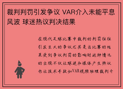 在现代足球比赛中,裁判的判罚往往引发巨大的争议,尤其是当比赛的结果受到争议判罚的影响时。这种情况的出现,不仅让球迷和媒体产生热议,也让技术手段如VAR(视频助理裁判)介入成为焦点。然而,VAR的介入并...