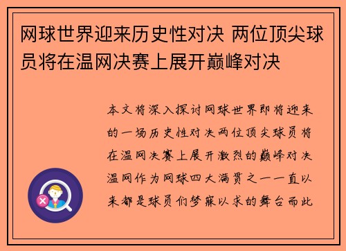 本文将深入探讨网球世界即将迎来的一场历史性对决——两位顶尖球员将在温网决赛上展开激烈的巅峰对决。温网作为网球四大满贯之一,一直以来都是球员们梦寐以求的舞台,而此次决赛更因其两位参赛者的历史地位和卓越表...