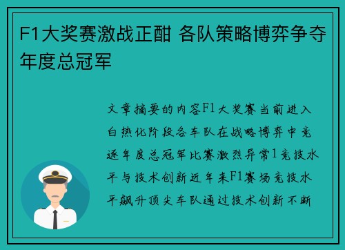文章摘要的内容:F1大奖赛当前进入白热化阶段,各车队在战略博弈中竞逐年度总冠军,比赛激烈异常。1、竞技水平与技术创新近年来,F1赛场竞技水平飙升,顶尖车队通过技术创新不断突破,改写比赛格局。驾驶员的个...