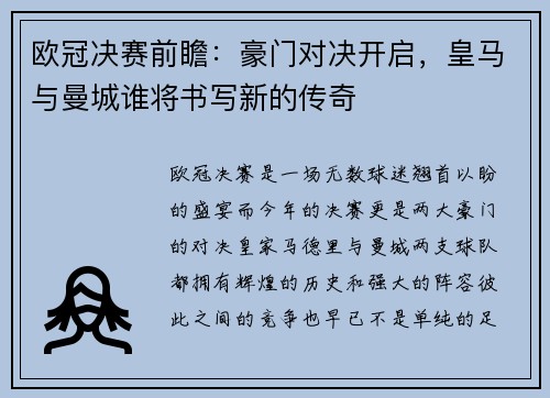 欧冠决赛是一场无数球迷翘首以盼的盛宴,而今年的决赛,更是两大豪门的对决——皇家马德里与曼城。两支球队都拥有辉煌的历史和强大的阵容,彼此之间的竞争也早已不是单纯的足球对抗,更是象征着足球文化、荣誉与未来...