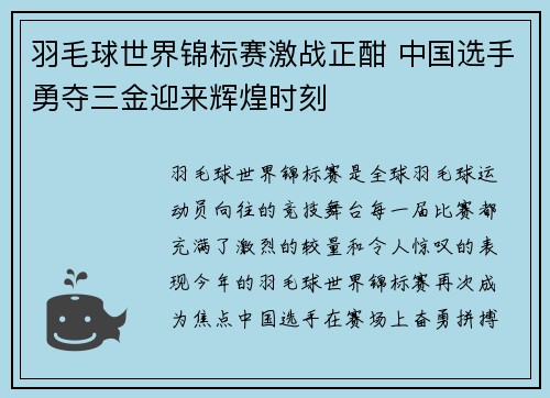 羽毛球世界锦标赛是全球羽毛球运动员向往的竞技舞台,每一届比赛都充满了激烈的较量和令人惊叹的表现。今年的羽毛球世界锦标赛再次成为焦点,中国选手在赛场上奋勇拼搏,最终勇夺三金,创造了属于中国羽毛球的辉煌时...