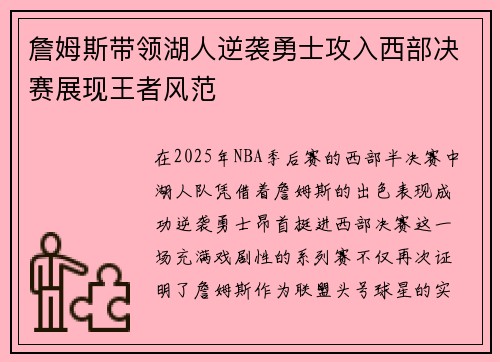 在2025年NBA季后赛的西部半决赛中,湖人队凭借着詹姆斯的出色表现,成功逆袭勇士,昂首挺进西部决赛。这一场充满戏剧性的系列赛,不仅再次证明了詹姆斯作为联盟头号球星的实力,也凸显了他在关键时刻的领导力...