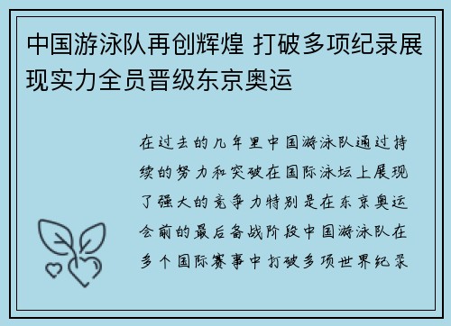 在过去的几年里,中国游泳队通过持续的努力和突破,在国际泳坛上展现了强大的竞争力。特别是在东京奥运会前的最后备战阶段,中国游泳队在多个国际赛事中打破多项世界纪录,展现出了实力与潜力。在这些赛事中,队员们...