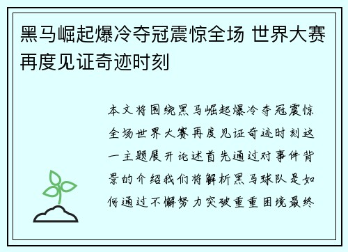 本文将围绕“黑马崛起爆冷夺冠震惊全场,世界大赛再度见证奇迹时刻”这一主题展开论述。首先,通过对事件背景的介绍,我们将解析黑马球队是如何通过不懈努力突破重重困境,最终实现震撼全场的胜利。接着,文章将从四...