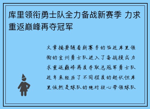 文章摘要:随着新赛季的临近,库里领衔的金州勇士队进入了备战模式,力求重返巅峰、再度夺取总冠军。勇士队近年来经历了不同程度的起伏,但库里依然是球队的绝对核心,带领球队不断追求卓越。本文将从四个方面详细探...