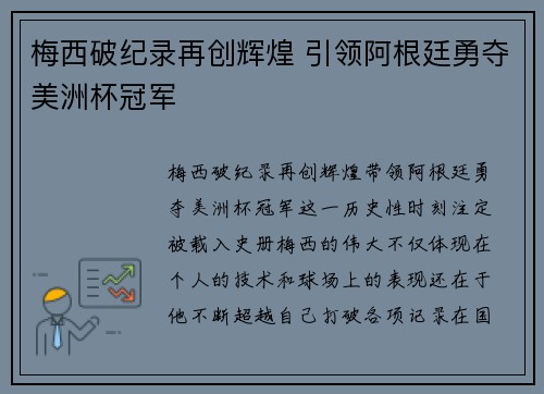 梅西破纪录再创辉煌,带领阿根廷勇夺美洲杯冠军,这一历史性时刻注定被载入史册。梅西的伟大不仅体现在个人的技术和球场上的表现,还在于他不断超越自己,打破各项记录,在国际大赛中带领阿根廷获得了重要的胜利。本...