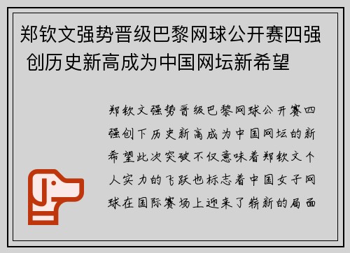 郑钦文强势晋级巴黎网球公开赛四强,创下历史新高,成为中国网坛的新希望。此次突破不仅意味着郑钦文个人实力的飞跃,也标志着中国女子网球在国际赛场上迎来了崭新的局面。在这篇文章中,我们将从四个方面深入分析郑...