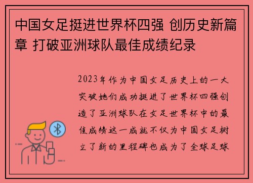 2023年,作为中国女足历史上的一大突破,她们成功挺进了世界杯四强,创造了亚洲球队在女足世界杯中的最佳成绩。这一成就不仅为中国女足树立了新的里程碑,也成为了全球足球界的一个热点话题。从技战术水平的提升...