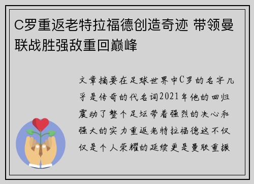 文章摘要:在足球世界中,C罗的名字几乎是传奇的代名词。2021年,他的回归震动了整个足坛,带着强烈的决心和强大的实力重返老特拉福德。这不仅仅是个人荣耀的延续,更是曼联重振雄风的一次机会。自从C罗回归曼...