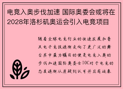 随着全球电竞行业的快速发展和普及,电子竞技逐渐走向了更广泛的舞台,其中最为瞩目的便是电竞入奥的步伐加速。国际奥委会(IOC)对于电竞的态度逐渐从质疑到认可,并且有迹象表明,电竞或将在2028年洛杉矶奥...