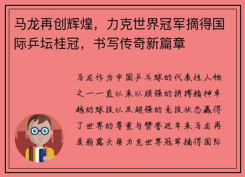 马龙,作为中国乒乓球的代表性人物之一,一直以来以顽强的拼搏精神、卓越的球技以及超强的竞技状态赢得了世界的尊重与赞誉。近年来,马龙再度崭露头角,力克世界冠军,摘得国际乒坛桂冠,继续书写着属于他的传奇篇章...