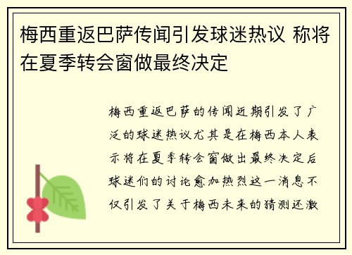 梅西重返巴萨的传闻近期引发了广泛的球迷热议,尤其是在梅西本人表示将在夏季转会窗做出最终决定后,球迷们的讨论愈加热烈。这一消息不仅引发了关于梅西未来的猜测,还激起了对于巴萨俱乐部未来方向的深刻反思。梅西...