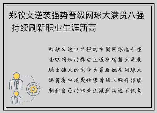 郑钦文,这位年轻的中国网球选手,在全球网坛的舞台上逐渐崭露头角,展现出强大的竞争力。最近,她在网球大满贯赛中逆袭强势晋级八强,并持续刷新自己的职业生涯新高。这不仅是郑钦文个人成就的标志,也是中国网球在...
