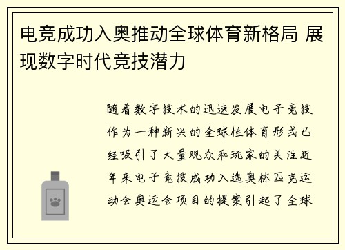 随着数字技术的迅速发展,电子竞技作为一种新兴的全球性体育形式,已经吸引了大量观众和玩家的关注。近年来,电子竞技成功入选奥林匹克运动会(奥运会)项目的提案,引起了全球体育界的广泛关注。这一举措不仅代表着...