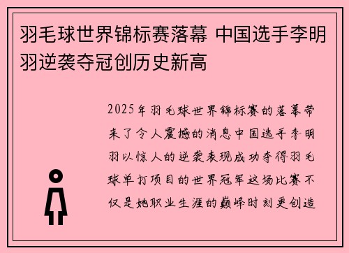2025年羽毛球世界锦标赛的落幕,带来了令人震撼的消息——中国选手李明羽以惊人的逆袭表现,成功夺得羽毛球单打项目的世界冠军。这场比赛不仅是她职业生涯的巅峰时刻,更创造了中国羽毛球历史的新高。通过与顶级...