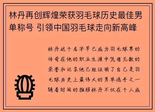 林丹,这个名字早已成为羽毛球界的传奇。在他的职业生涯中,凭借无数的荣誉和记录,他已经证明了自己是羽毛球历史上最伟大的男单选手之一。随着时间的推移,林丹不仅在个人成就上再创辉煌,还通过自身的努力和精神,...