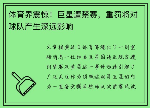 文章摘要:近日,体育界爆出了一则重磅消息,一位知名巨星因违反规定遭到禁赛及重罚,这一事件迅速引起了广泛关注。作为顶级运动员,巨星的行为一直备受瞩目,然而此次禁赛风波不仅对该运动员本人产生深远影响,也给...