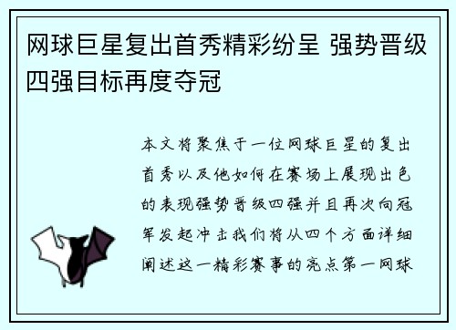 本文将聚焦于一位网球巨星的复出首秀,以及他如何在赛场上展现出色的表现,强势晋级四强,并且再次向冠军发起冲击。我们将从四个方面详细阐述这一精彩赛事的亮点:第一,网球巨星复出的意义与影响;第二,首秀赛场的...