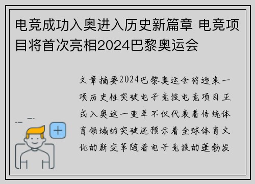 文章摘要:2024巴黎奥运会将迎来一项历史性突破——电子竞技(电竞)项目正式入奥。这一变革不仅代表着传统体育领域的突破,还预示着全球体育文化的新变革。随着电子竞技的蓬勃发展,它已不再仅仅是年轻人娱乐消...