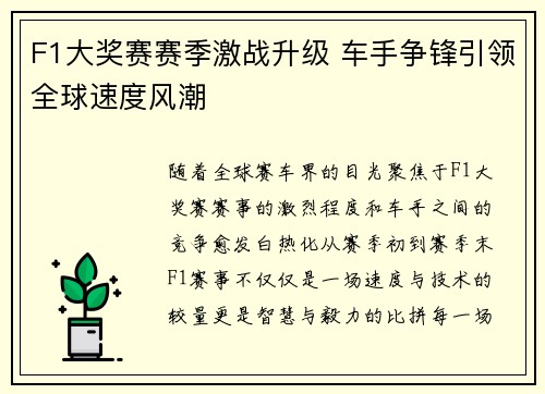 随着全球赛车界的目光聚焦于F1大奖赛,赛事的激烈程度和车手之间的竞争愈发白热化。从赛季初到赛季末,F1赛事不仅仅是一场速度与技术的较量,更是智慧与毅力的比拼。每一场比赛都充满了悬念,车手们的精彩表现不...