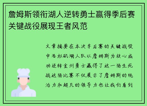 文章摘要:在本次季后赛的关键战役中,洛杉矶湖人队以詹姆斯为核心,成功逆转金州勇士,赢得了这一场生死战。这场比赛不仅展示了詹姆斯的统治力和超凡的领导力,也让我们看到了湖人队在压力下的强大凝聚力。本篇文章...