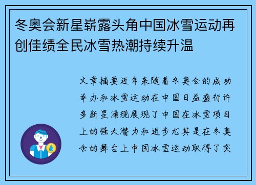 • 冬奥会新星崭露头角中国冰雪运动再创佳绩全民冰雪热潮持续升温