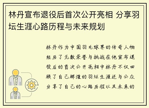 林丹,作为中国羽毛球界的传奇人物,经历了无数荣誉与挑战。在他宣布退役后的首次公开亮相中,林丹不仅回顾了自己辉煌的羽坛生涯,还与公众分享了自己的心路历程以及未来的规划。此次公开亮相,林丹的情感真挚、回忆...