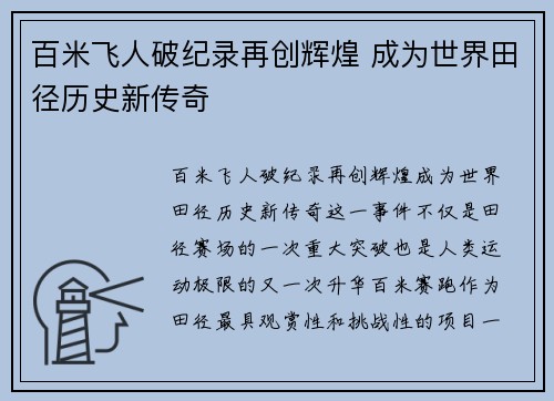 • 百米飞人破纪录再创辉煌 成为世界田径历史新传奇