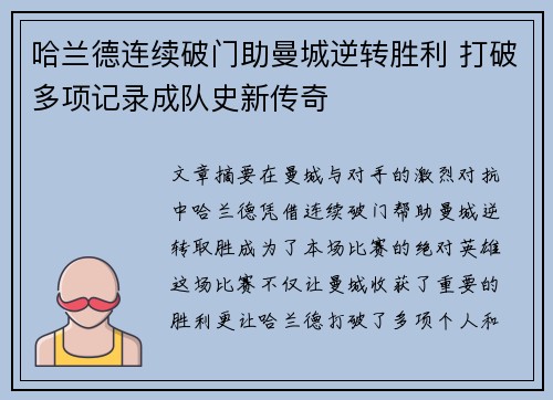 文章摘要:在曼城与对手的激烈对抗中,哈兰德凭借连续破门帮助曼城逆转取胜,成为了本场比赛的绝对英雄。这场比赛不仅让曼城收获了重要的胜利,更让哈兰德打破了多项个人和队史记录,进一步巩固了他在球队中的地位。...