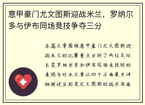 本篇文章围绕意甲豪门尤文图斯迎战米兰的比赛,重点分析了两位足坛巨星罗纳尔多和伊布同场竞技时的表现与对决。文章从四个方面展开详细阐述,分别是“尤文图斯的战术布局”,“米兰的挑战与应对”,“罗纳尔多与伊布...
