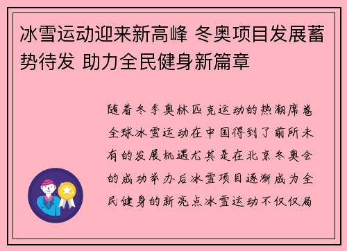 • 冰雪运动迎来新高峰 冬奥项目发展蓄势待发 助力全民健身新篇章
