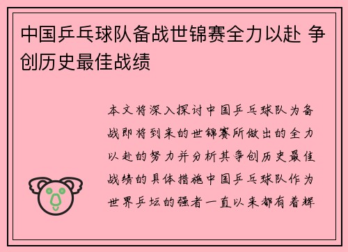本文将深入探讨中国乒乓球队为备战即将到来的世锦赛所做出的全力以赴的努力,并分析其争创历史最佳战绩的具体措施。中国乒乓球队作为世界乒坛的强者,一直以来都有着辉煌的历史和卓越的表现。在备战世锦赛的过程中,...