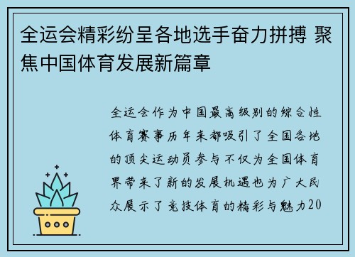 文章摘要:全运会作为中国体育的顶级盛会,不仅是各省市展示竞技实力的重要舞台,更是全国体育发展水平的集中体现。在激烈的竞争中,各省市运动员奋勇争先,争夺金牌,展现出非凡的拼搏精神与竞技风采。本文将从多个...