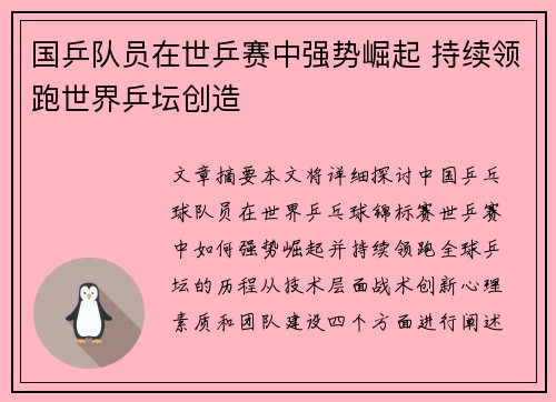 文章摘要:本文将详细探讨中国乒乓球队员在世界乒乓球锦标赛(世乒赛)中如何强势崛起,并持续领跑全球乒坛的历程。从技术层面、战术创新、心理素质和团队建设四个方面进行阐述,展现了国乒队员在世乒赛上不断超越自...