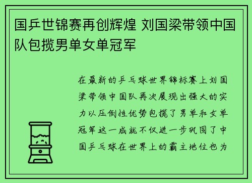 在最新的乒乓球世界锦标赛上,刘国梁带领中国队再次展现出强大的实力,以压倒性优势包揽了男单和女单冠军。这一成就不仅进一步巩固了中国乒乓球在世界上的霸主地位,也为国乒在全球体育竞技领域再添光彩。刘国梁作为...