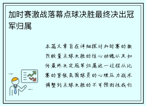 本篇文章旨在详细探讨加时赛的激烈较量,点球决胜的惊心动魄,以及如何最终决定冠军归属这一过程。从比赛的紧张氛围、球员的心理压力、战术调整到点球决胜的不可预测性,我们将从多个方面分析这场经典对决。文章通过...