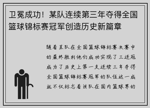随着某队在全国篮球锦标赛决赛中的最终胜利,他们成功实现了三连冠,成为了历史上第一支连续三年夺得全国篮球锦标赛冠军的队伍。这一成就不仅标志着该队在国内篮球界的统治地位,更为中国篮球史册增添了浓墨重彩的一...