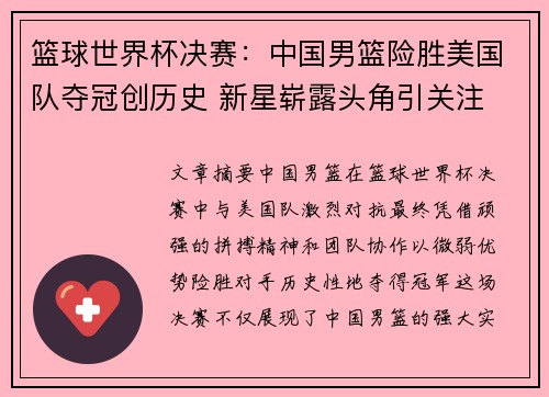 文章摘要:中国男篮在篮球世界杯决赛中与美国队激烈对抗,最终凭借顽强的拼搏精神和团队协作,以微弱优势险胜对手,历史性地夺得冠军。这场决赛不仅展现了中国男篮的强大实力,也标志着他们在世界篮球舞台上的崭新突...