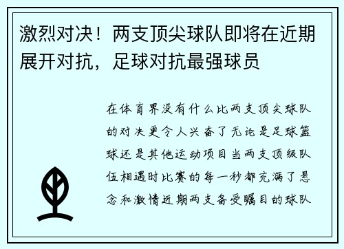 在体育界,没有什么比两支顶尖球队的对决更令人兴奋了。无论是足球、篮球还是其他运动项目,当两支顶级队伍相遇时,比赛的每一秒都充满了悬念和激情。近期,两支备受瞩目的球队即将展开一场巅峰对决,这场比赛不仅是...