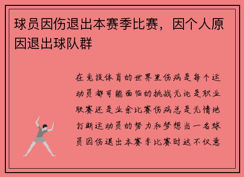 在竞技体育的世界里,伤病是每个运动员都可能面临的挑战。无论是职业联赛还是业余比赛,伤病总是无情地打断运动员的努力和梦想。当一名球员因伤退出本赛季比赛时,这不仅意味着个人的遗憾,也对整个团队造成了深远的...