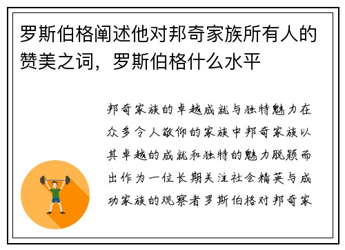 邦奇家族的卓越成就与独特魅力 在众多令人敬仰的家族中,邦奇家族以其卓越的成就和独特的魅力脱颖而出。作为一位长期关注社会精英与成功家族的观察者,罗斯伯格对邦奇家族的赞美之词不仅体现了对其成就的认可,更彰...