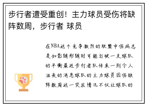 在NBA这个竞争激烈的联盟中,伤病总是如影随形,随时可能打破一支球队的平衡。最近,步行者队传来一则令人沮丧的消息:球队的主力球员因伤缺阵数周。这一突发情况不仅让球队的战斗力大打折扣,也让球迷们为球队的...