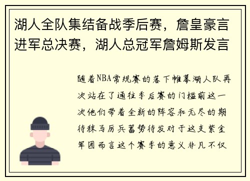 随着NBA常规赛的落下帷幕,湖人队再次站在了通往季后赛的门槛前。这一次,他们带着全新的阵容和无尽的期待,秣马厉兵,蓄势待发。对于这支紫金军团而言,这个赛季的意义非凡——不仅仅是一次普通的季后赛征程,更...