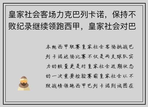 本轮西甲联赛,皇家社会客场挑战巴列卡诺,这场比赛不仅是两支球队实力的较量,更是对皇家社会近期状态的一次重要检验。赛前,皇家社会以不败战绩领跑西甲,巴列卡诺则试图在主场打破对手的连胜势头。比赛一开始,皇...