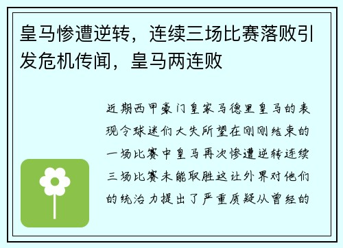 近期,西甲豪门皇家马德里(皇马)的表现令球迷们大失所望。在刚刚结束的一场比赛中,皇马再次惨遭逆转,连续三场比赛未能取胜,这让外界对他们的统治力提出了严重质疑。从曾经的“Invincibles”到如今的...