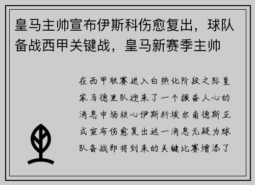 在西甲联赛进入白热化阶段之际,皇家马德里队迎来了一个振奋人心的消息——中场核心伊斯科·埃尔南德斯正式宣布伤愈复出。这一消息无疑为球队备战即将到来的关键比赛增添了更多信心与火力。伊斯科的回归不仅填补了球...