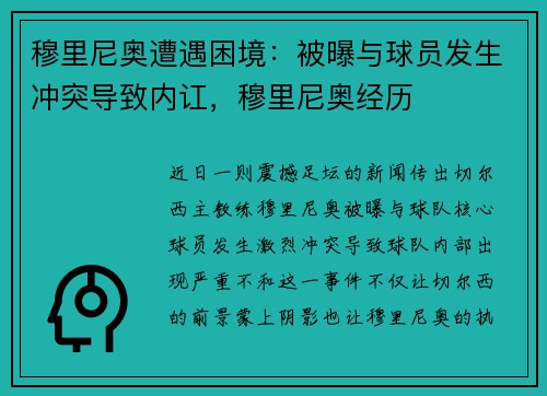 近日,一则震撼足坛的新闻传出:切尔西主教练穆里尼奥被曝与球队核心球员发生激烈冲突,导致球队内部出现严重不和。这一事件不仅让切尔西的前景蒙上阴影,也让穆里尼奥的执教风格再次成为媒体和球迷讨论的焦点。 据...