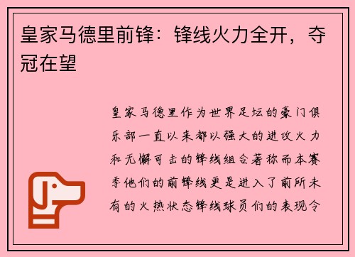 皇家马德里,作为世界足坛的豪门俱乐部,一直以来都以强大的进攻火力和无懈可击的锋线组合著称。而本赛季,他们的前锋线更是进入了前所未有的火热状态,锋线球员们的表现令人瞩目,球队的整体进攻水平也随之达到了新...