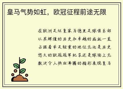 在欧洲足坛,皇家马德里足球俱乐部以其辉煌的历史和卓越的成就,一直占据着举足轻重的地位。无论是历史悠久的欧冠冠军纪录,还是球场上无数次令人热血沸腾的精彩表现,皇马总是能够在关键时刻展现出强大的气场和独特...