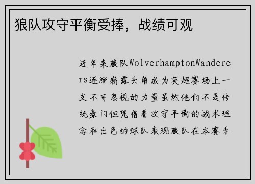 近年来,狼队(WolverhamptonWanderers)逐渐崭露头角,成为英超赛场上一支不可忽视的力量。虽然他们不是传统豪门,但凭借着攻守平衡的战术理念和出色的球队表现,狼队在本赛季的英超联赛中无...